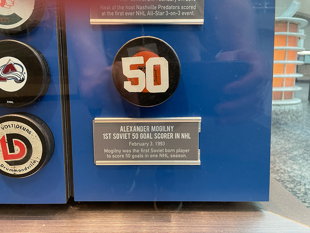 Then, on my way back to King Street I saw the wall of pucks—one of which was Alexander Mogilny’s 50th from the year he scored 76 to become the first Soviet-born player to hit fifty in a single season. They do remember who he is! Now they just need to finally enshrine him.