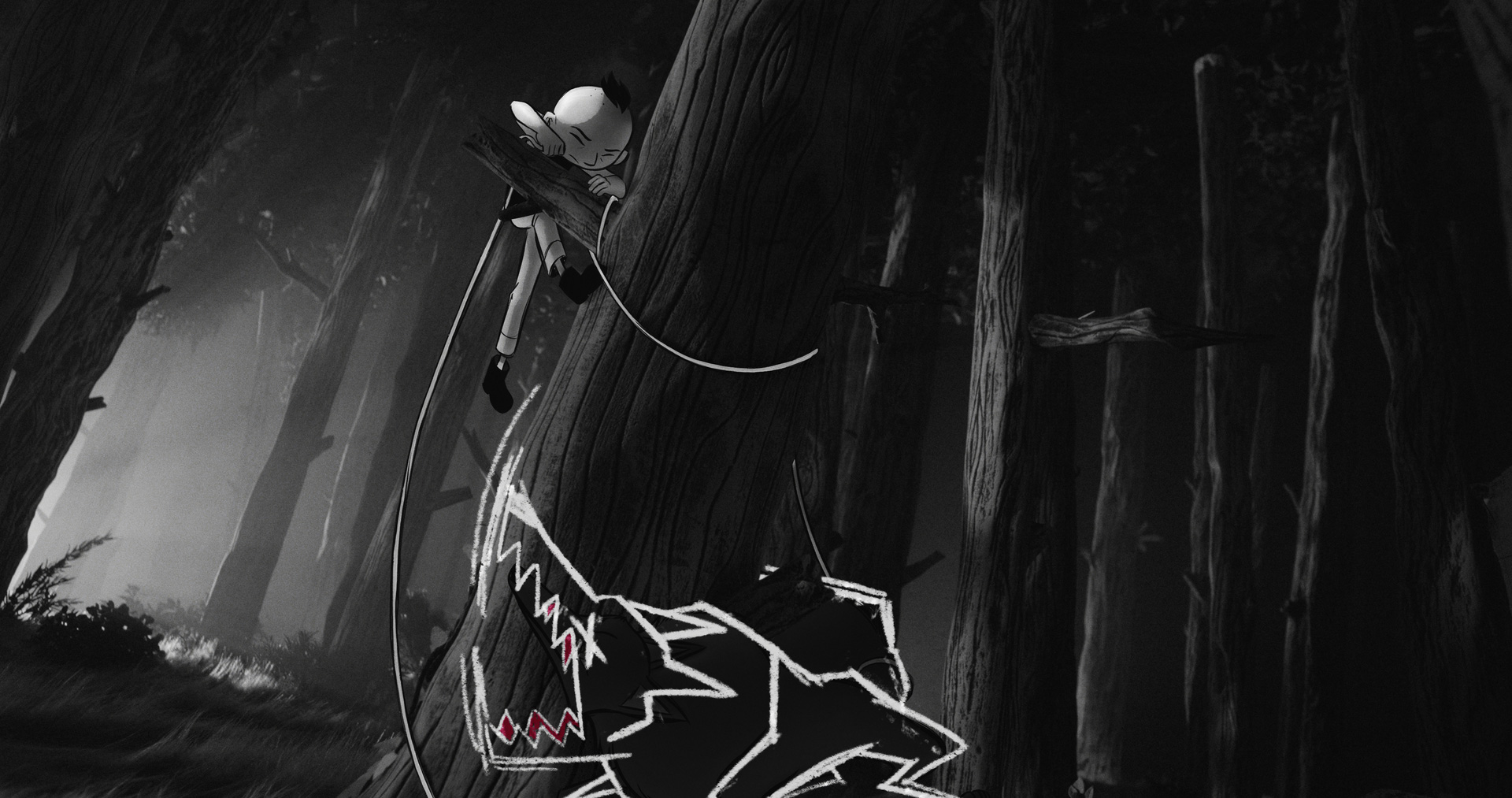 The film’s animation is a decent hybrid between hand-drawn and computer-generated with sets and (most) objects rendered with the latter and characters moving above them via the former. There’s Peter, Bird, Duck, Cat, Grandfather, and Wolf all living in close proximity around a stone fenced home within a forested meadow. While the whole feels familiar in many regards (save the black and white monochrome augmented by splashes of red), the real intrigue lies in the superimposition of Bono’s zigzag-toothed wolf upon the figure itself as a sort of mask manifested by Peter’s fear.