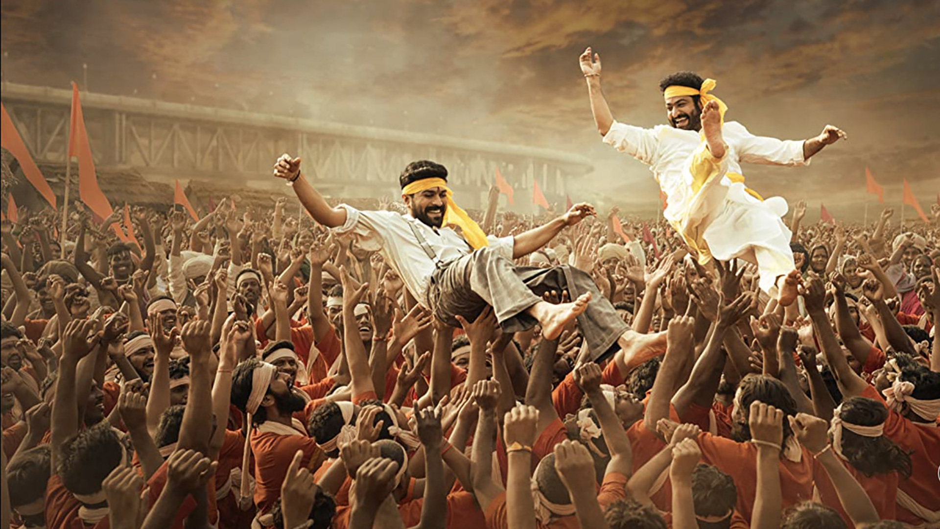 And why shouldn’t Bheem (N.T. Rama Rao Jr.) and Ram (Ram Charan Teja) become Gods? These are two men who would laugh in the face of danger if they weren’t so gosh darn serious every time danger rears its head (it’s often, very often). The former is his peaceful village’s champion, sent to Delhi to rescue a young girl the governor “bought” by any means necessary. The latter is an ambitious royal officer in the governor’s army looking for a promotion by single-handedly jumping into a violent gang of Indian civilians to arrest someone who dared to throw a rock, earning a couple concussions for his trouble. They were rendered as Gods well before the plot (and music lyrics) caught up. Gods, patriots, lovers, and friends-to-the-end. Who better to start an explosive revolution?