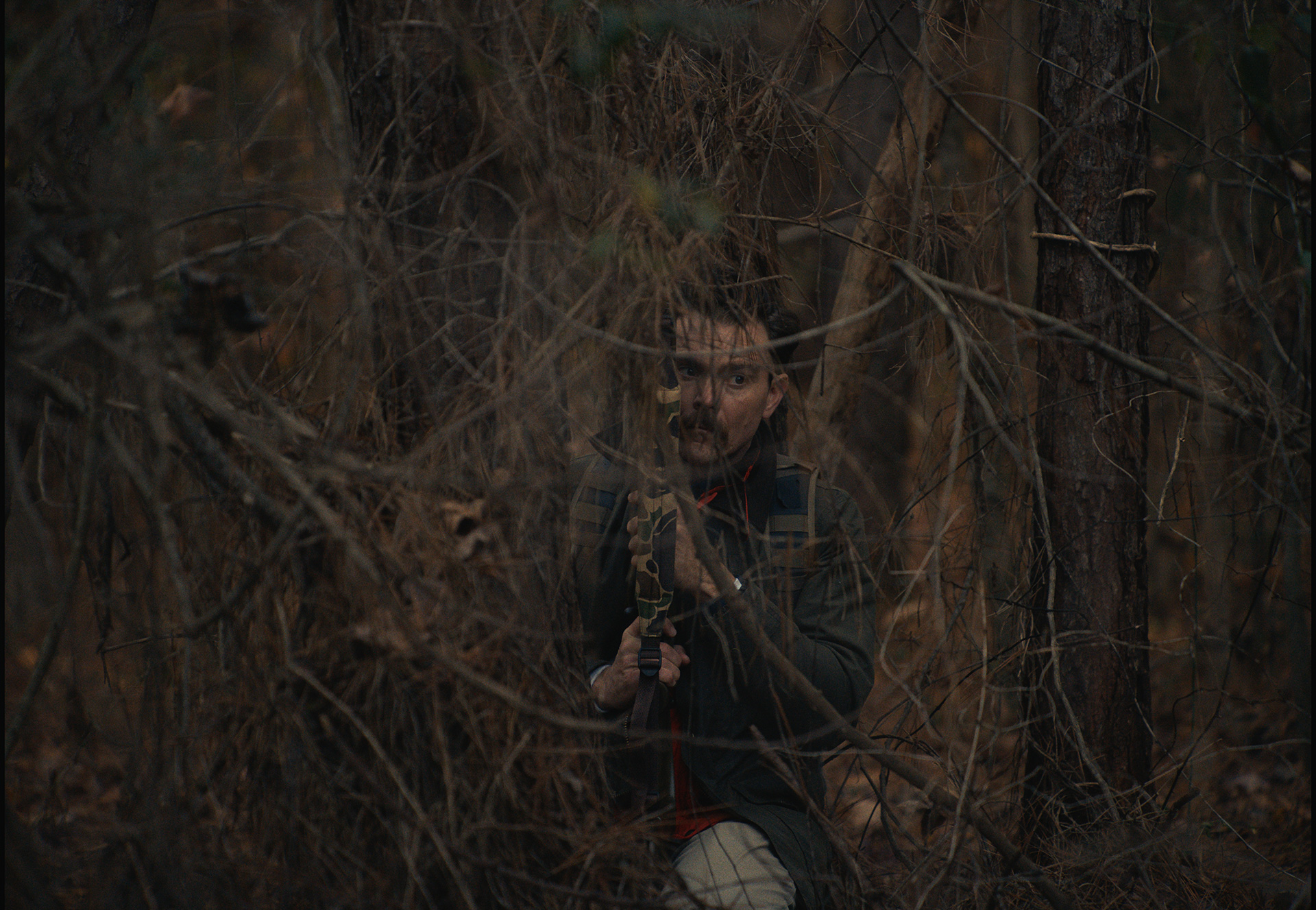 So much so that Machoian can have fun with the sound design to put us inside the character’s head. Because it’s one thing to laugh as he drops bullets and fails to secure the clip to his borrowed rifle. It’s another to watch long takes of his ineptitude conclude with piped-in applause when he somehow achieves a goal as small as finding the tree stand on his friend’s property and climbing up to settle in for a long day of waiting … and sleeping. Between these comic gestures for the audience and the inevitable voices that soon haunt his every waking minute, the point of the narrative comes through crystal clear: accept your limitations. That’s not to say you shouldn’t expand upon them, but do so intelligently and without fear taking the wheel.