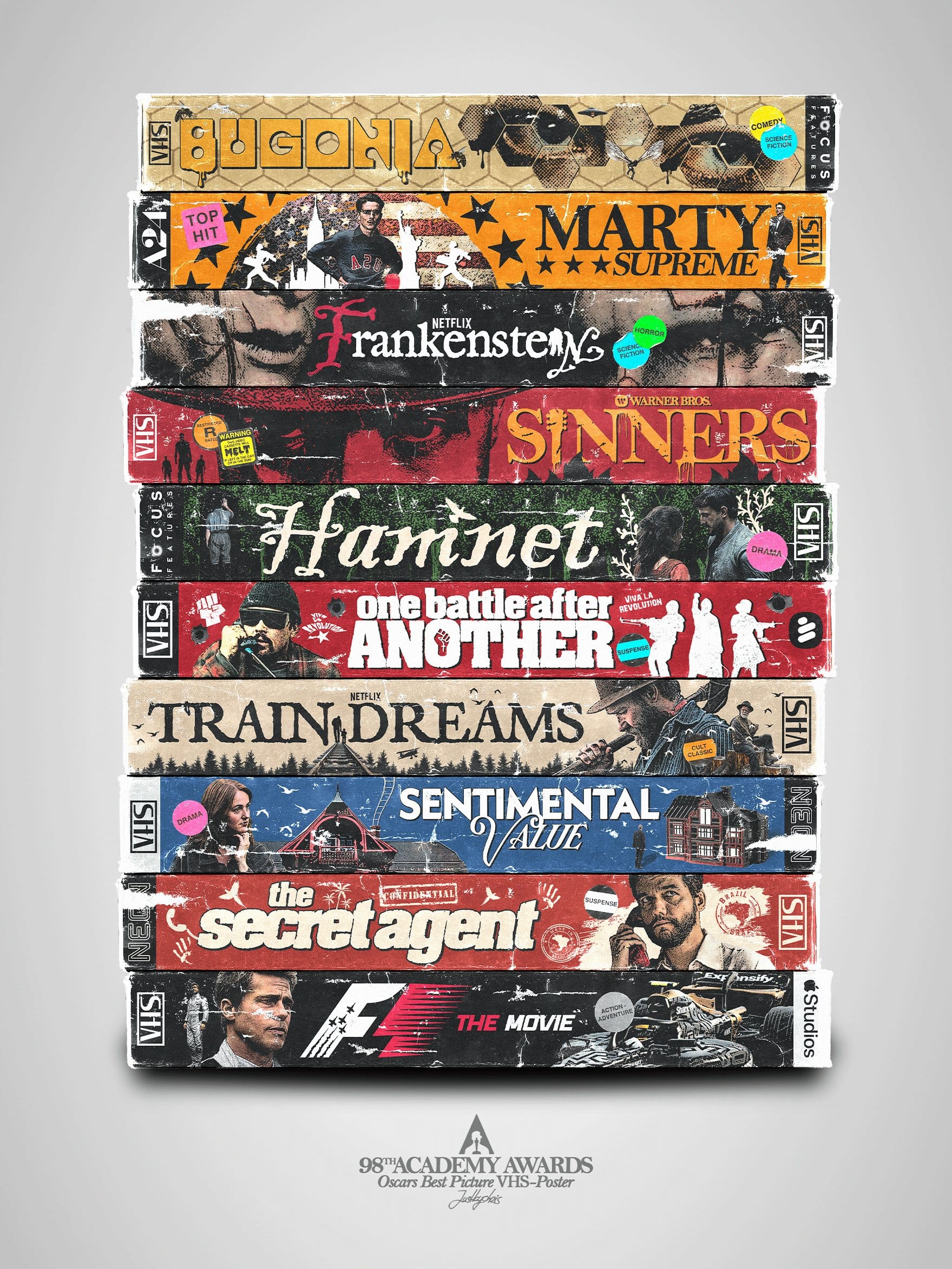 I will leave you with a couple of my favorite annual Best Picture inspired artworks via Olly Gibbs (statues) and justbychris* (VHS stack).